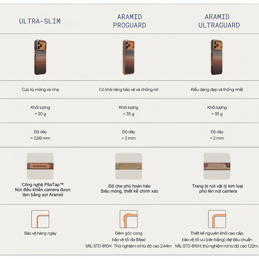Với khả năng vượt qua bài kiểm định khắt khe ở độ cao 2,44 mét và đạt chứng nhận MIL-STD-810H chuẩn quân sự Hoa Kỳ, PITAKA Aramid Proguard mang đến sự bảo vệ toàn diện cho iPhone trong mọi tình huống. Từ những va chạm bất ngờ trong sinh hoạt hằng ngày đến các thử thách khắc nghiệt, sản phẩm luôn giữ cho thiết bị an toàn tuyệt đối. Không chỉ là lớp giáp bền bỉ, đây còn là sự bảo chứng cho cảm giác luôn an tâm và tự tin khi sử dụng.