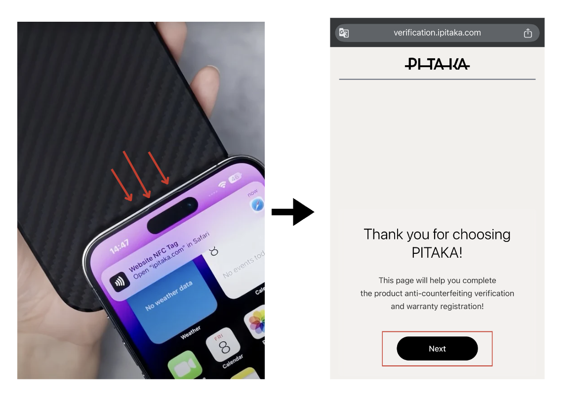 Ngoài ra, một số sản phẩm như ốp lưng, vòng giữ điện thoại của PITAKA có tích hợp NFC để kiểm tra hàng chính hãng, cách thực hiện như sau: