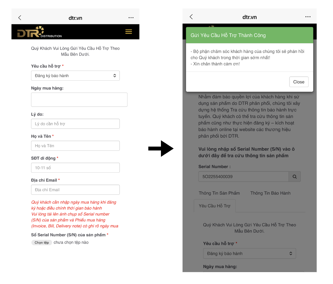 Bước 2: Sau khi quét mã QR code, hệ thống sẽ tự động dẫn bạn đến trang tra cứu và đăng ký bảo hành. Tại đây, mã Serial Number của sản phẩm sẽ được điền sẵn vào ô tra cứu thông tin.