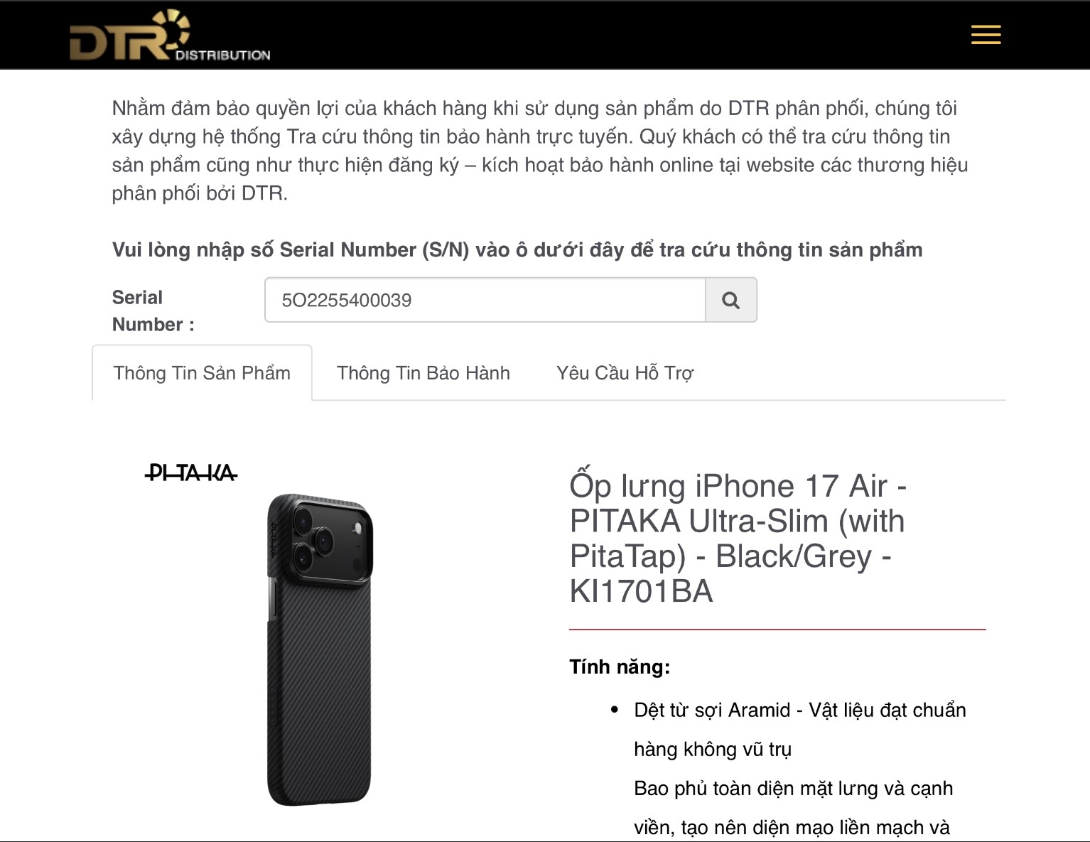Trường hợp 1: Nếu hệ thống hiển thị thông tin như ảnh minh họa, sản phẩm của bạn thuộc thương hiệu PITAKA được phân phối chính hãng bởi DTR