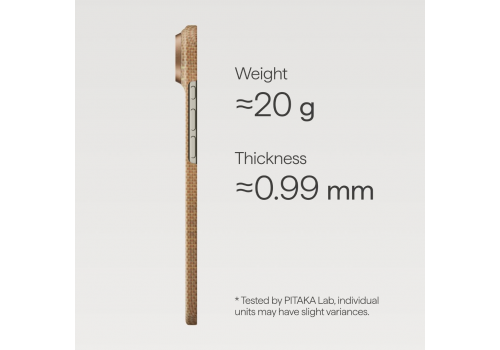 Mang vẻ đẹp lấp lánh của ánh nắng phản chiếu trên mặt nước, PITAKA Ultra-Slim bộ sưu tập Glints of Gold đem đến chiếc ốp lưng như một tác phẩm nghệ thuật sống động. Sợi Aramid cao cấp kết hợp công nghệ dệt độc quyền Fusion Weaving tạo hiệu ứng vàng chuyển động mềm mại dưới ánh sáng, vừa mỏng nhẹ tinh tế vừa bảo vệ tối ưu và tương thích hoàn hảo với MagSafe.